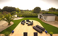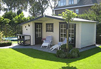 Популярная стильная и универсальная модель дачного домика с боковой пристройкой и навесом. Боковая пристройка может использоваться в качестве дополнительного места хранения, что имеет немаловажное значение для владельцев частных домов за городом.