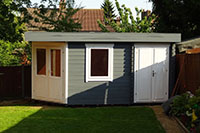 Модель совмещает в себе функции беседки и сарая для хранения. Оба помещения разделены стеной. Имеется двое распашных застекленных дверей для входа в беседку и двери побольше, ведущие непосредственно в сарай.