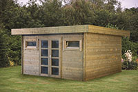 Современная модель с плоской крышей, двойными застекленными дверями и прямоугольными, горизонтально расположенными окнами предназначена для любого типа загородного участка. Может использоваться в качестве летнего домика или беседки.